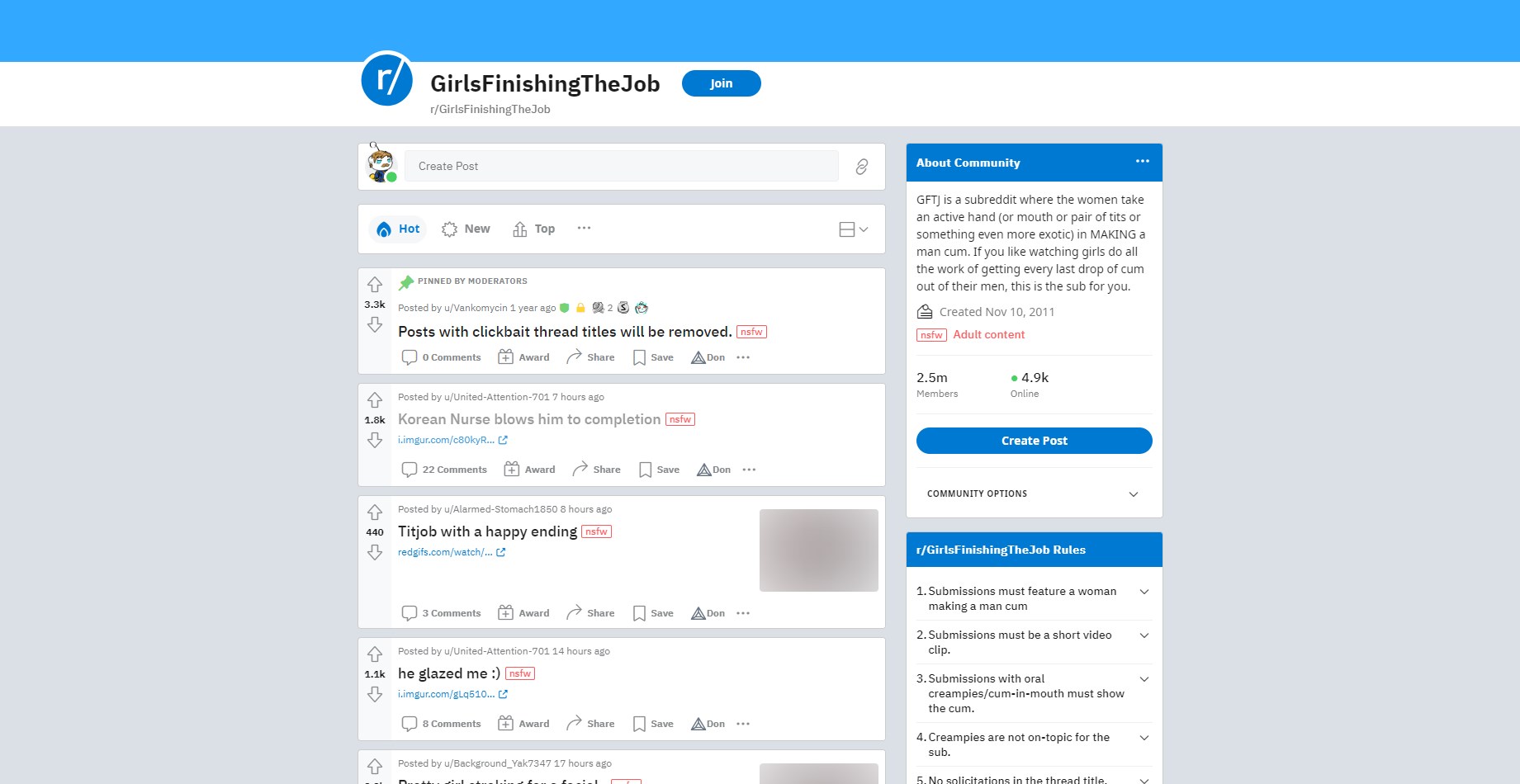 r/GirlsFinishingTheJob is 3.5 million members strong and dedicated to one thing: watching girls make guys cum. Handjobs, blowjobs, titjobs, footjobs. Whatever technique she's using, the important part is that SHE finishes HIM. The best posts show the exact moment of the cumshot with the girl actively working for it, not just passively receiving. You'll see eager girlfriends jerking their man off until he explodes, pornstars deepthroating until they get a mouthful, and everything where the girl takes control of making him bust.