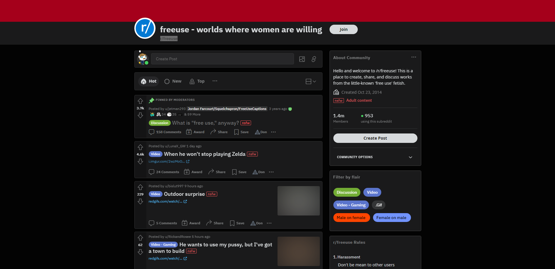 O r/freeuse tem 2,1 milhões de membros que exploram a fantasia em que as mulheres estão disponíveis para serem fodidas a qualquer hora, em qualquer lugar, por qualquer pessoa, sem pedir. É um tipo específico de perversão em que as garotas agem como se o sexo fosse tão casual quanto um aperto de mão. Uma garota preparando o jantar enquanto é fodida por trás sem sequer olhar para cima. Ser usada no meio de uma reunião. O conteúdo varia de cenas pornográficas roteirizadas a hentai e legendas. É um submarino com muitas fantasias, em que o conceito é mais importante do que o conteúdo explícito em si.