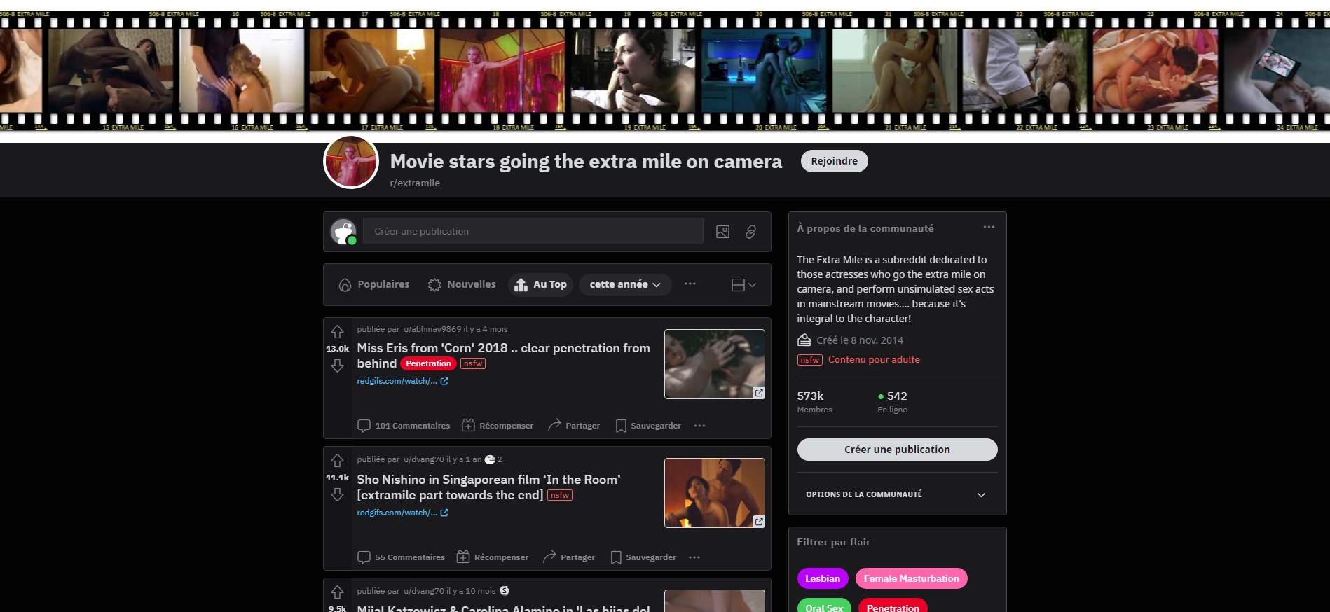r/extramile has 901K members documenting actresses who did real, unsimulated sex in mainstream movies. Not porn, but actual Hollywood and indie films where the actors actually fucked on camera "for the art." Real blowjobs, real penetration, real cumshots, all in movies you can find on regular streaming platforms. The sub catalogs every known instance of real sex in cinema. It's fascinating and hot at the same time, knowing these actors actually went all the way for their craft.
